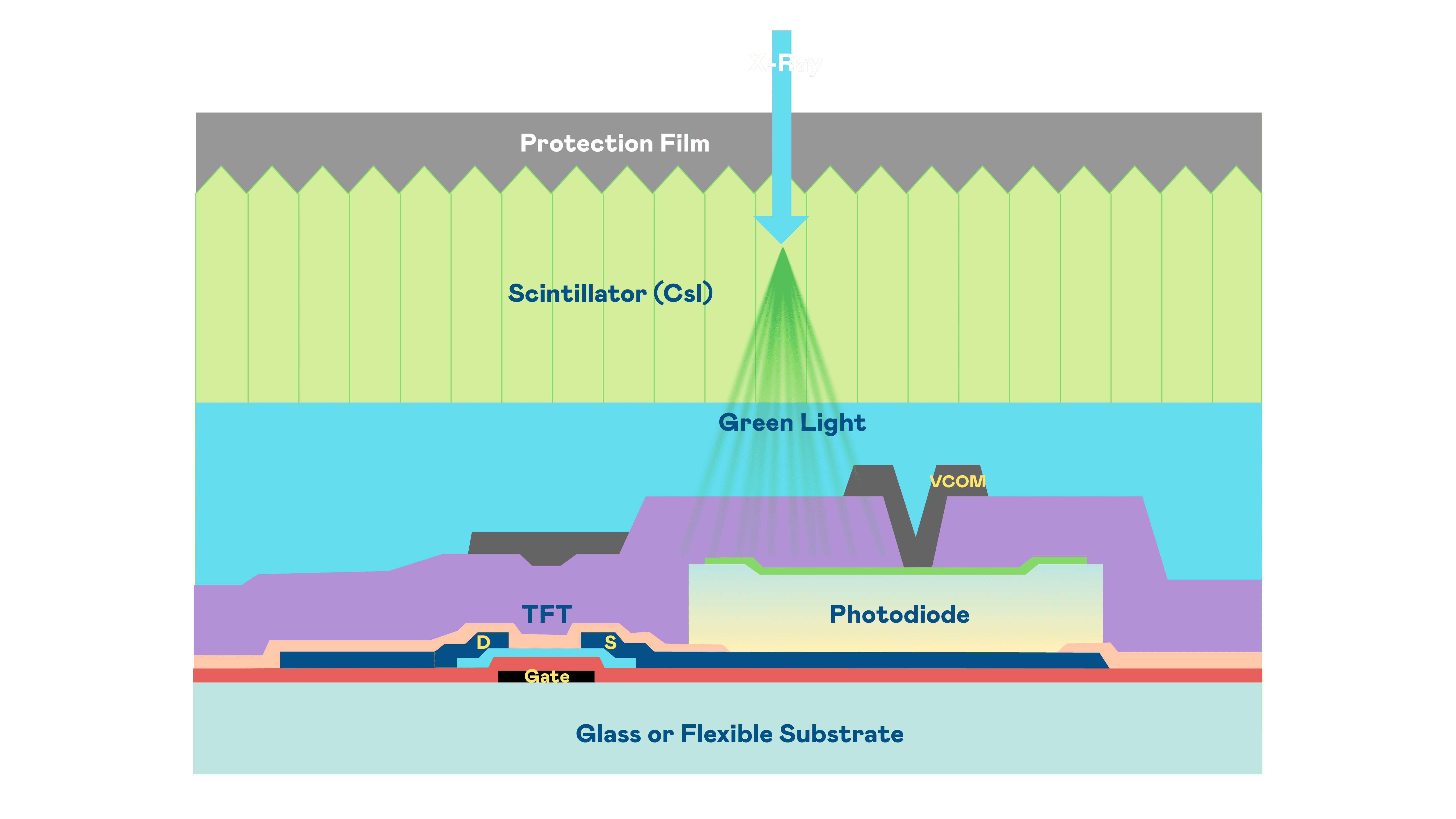 人生就是博的X光影像感测阵列使用薄膜电晶体 (TFT) 作为每个像素的读取开关,,搭配光电二极体(Photodiode)的光电转换元件,,,用以感测X光影像讯号。。。